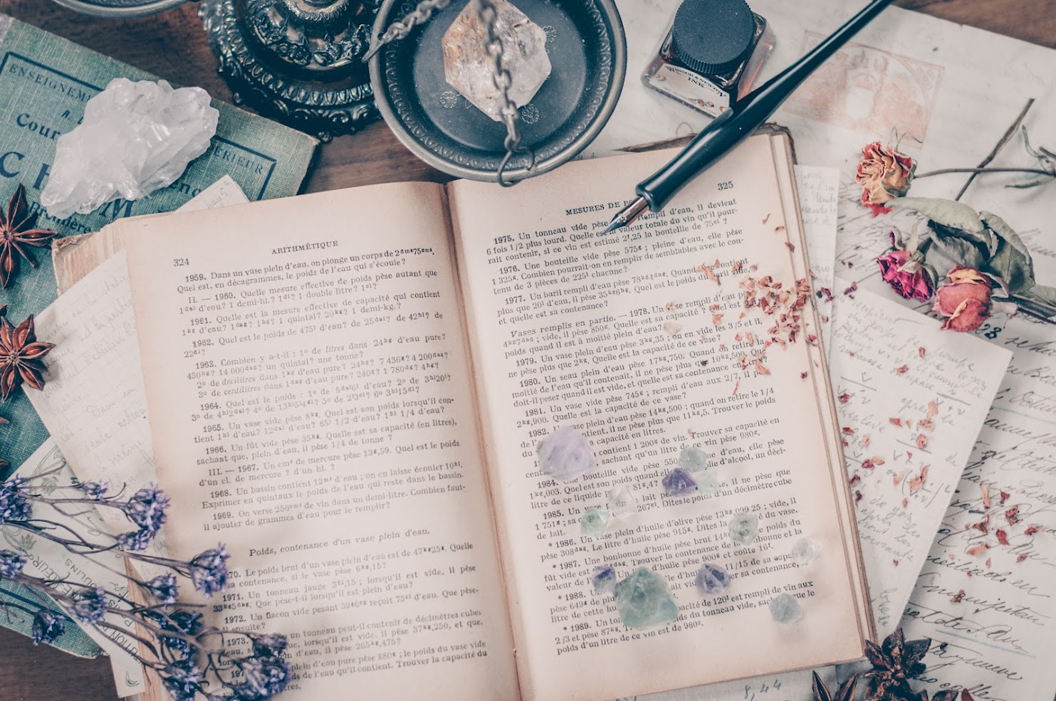 黒や深紅のアイテム、天然石、日記帳